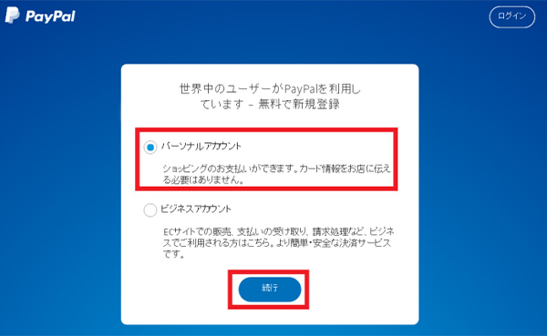 ●「パーソナルアカウント」を選択し、「続行」をクリックします。