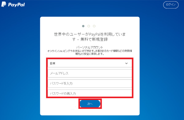 2. 「新規登録」→「パーソナルアカウント」を選び、メールアドレス、パスワードを設定