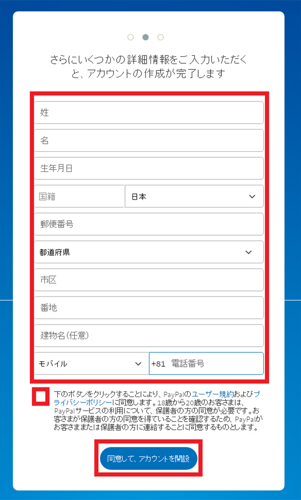 必須項目を入力したら、「ユーザー規約およびプライバシーポリシーに同意します」にチェックをいれ、「同意してアカウント開設」をクリックします。