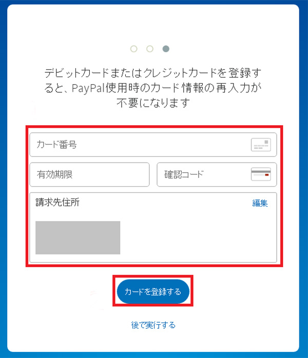 銀行口座からの支払いを希望する等でカードの登録をしない方は、カード情報は入力せず「後で実行する」をクリックしてください。