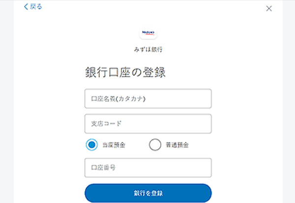 ●口座情報を入力し「銀行を登録」をクリックしてください。